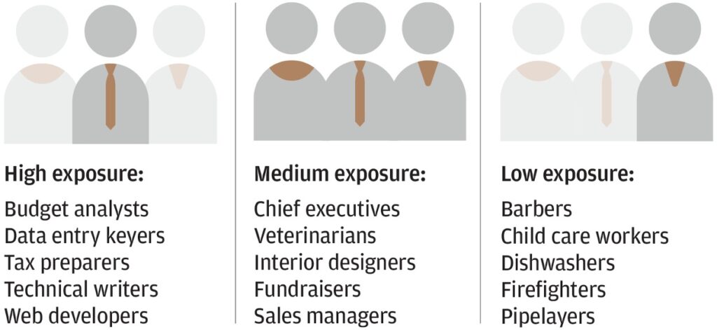 What may come as a surprise to many people is the group that is facing the greatest risk of job displacement. According to a Pew Research report, white-collar workers with bachelor’s degrees or higher are twice as likely to have jobs exposed to AI than individuals with only a high school diploma. This is because many at-risk roles require analytical, decision-making, and complex problem-solving skills—areas where AI excels. In addition, these positions often come with higher salaries, making them prime targets for automation as companies look to improve efficiency and trim costs.