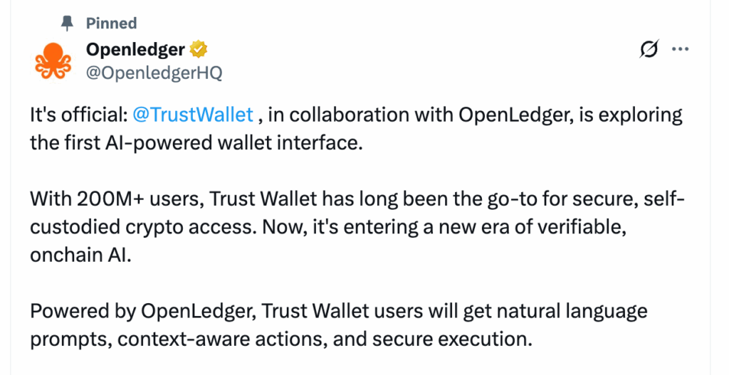 Under the partnership, Trust users will access Openledger’s AI stack inside the wallet, from natural language commands to customized on-chain automation.