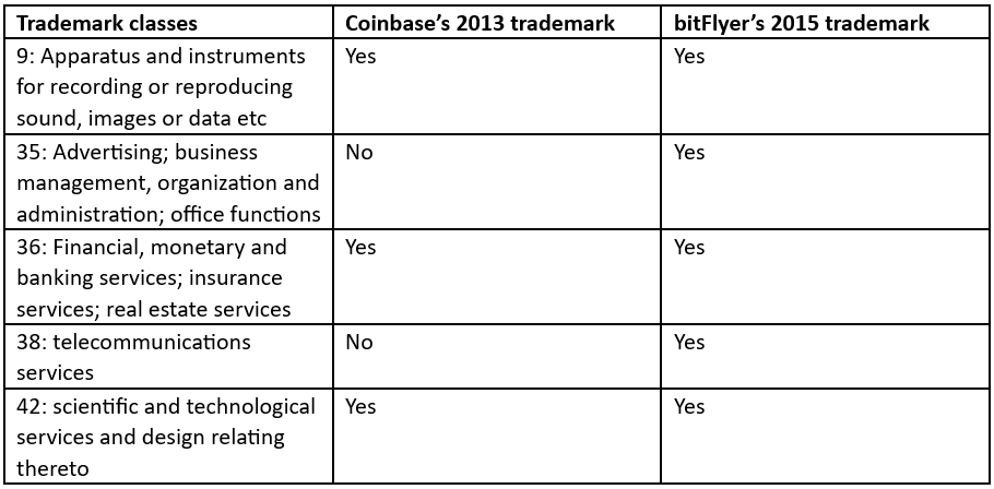 Coinbase filed with the European Intellectual Property Office, asking to have the trademark ruled invalid. It asked for this on two bases: first, the trademark risked confusion with an earlier trademark already granted to Coinbase in 2013 because that trademark related to three of the five classes of goods and services contained in bitFlyer’s 2015 trademark.
