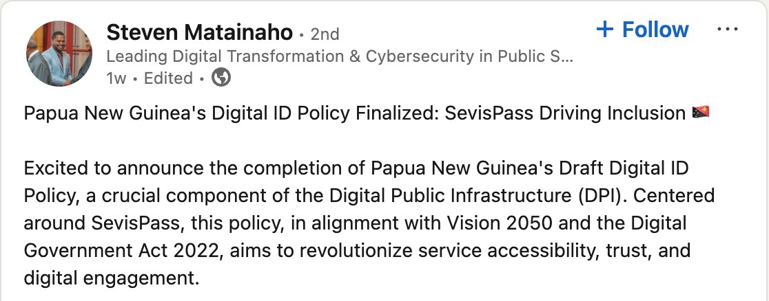ICT Minister Timothy Masiu first announced the draft policy in December 2024 to unify digital identity for PNG’s 10.8 million citizens. He stated that the aim was to boost the country’s digital economy and enable every citizen to participate while also addressing inefficiencies in public service delivery.