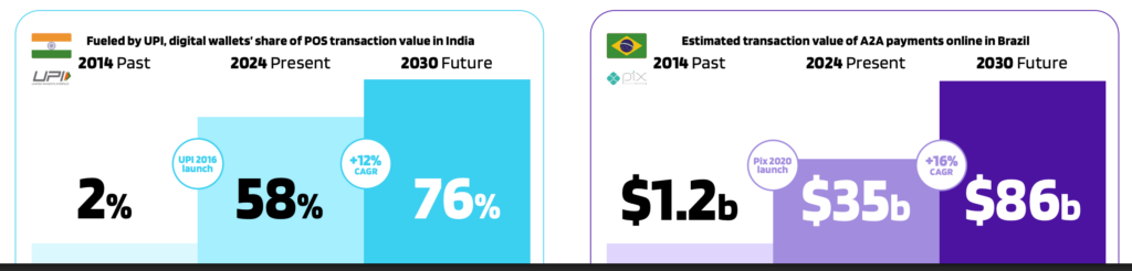 In India, the Unified Payments Interface (UPI) now accounts for nearly 60% of all point of sale (POS) transactions, up from 2% in 2014, and is projected to hit 76% by 2030. Thailand’s PromptPay has a 41% market share, while Brazil’s Pix processed $35 billion in account-to-account payments last year, a massive increase from $1.2 billion in 2014.