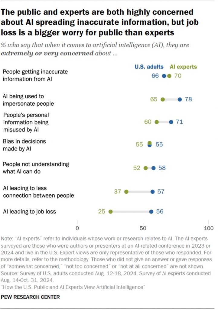 Another important takeaway from the Pew report was the divergence in concerns between experts and the general public. The general public’s top fear is that AI will be used to impersonate people. For experts, the biggest concern is