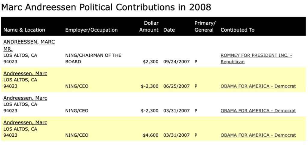 Andreessen deserves credit for calling out these abuses, but his advocacy comes with a bitter irony. As the driving force behind a16z Capital and its parent, Andreessen Horowitz, two of the most influential venture capital firms in Silicon Valley, Andreessen has heavily shaped the landscape of cryptocurrency and fintech investment for over a decade. This is on top of him generally being a Democratic Party supporter and donor for many years despite things like the original Operation Chokepoint occurring under the Obama administration.