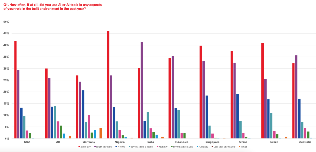 British design and engineering firm Arup surveyed 5,000 professionals in the built environment in ten countries on how AI has impacted their work, how they use it, and their future plans with the technology. The respondents were pooled from Nigeria, Australia, China, Brazil, India, Germany, Indonesia, the U.S., Singapore and the United Kingdom.