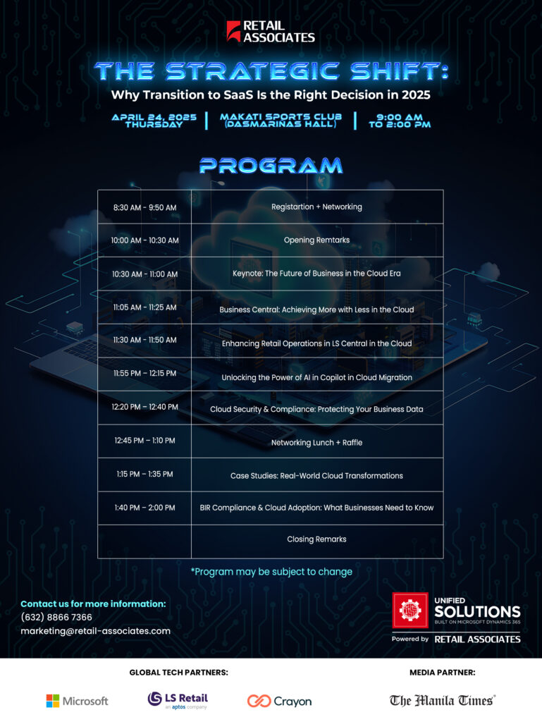 Retail Associates, a recognized LS Retail Diamond Partner and trusted Microsoft Solutions provider, has long been at the forefront of business technology in the Philippines. With decades of experience in ERP and cloud-based solutions, the company understands the practical challenges many businesses face when shifting from traditional systems to Software-as-a-Service (SaaS) platforms. This event is part of its broader mission to provide clarity, support, and expert guidance to organizations across retail, dining, hospitality, and distribution.