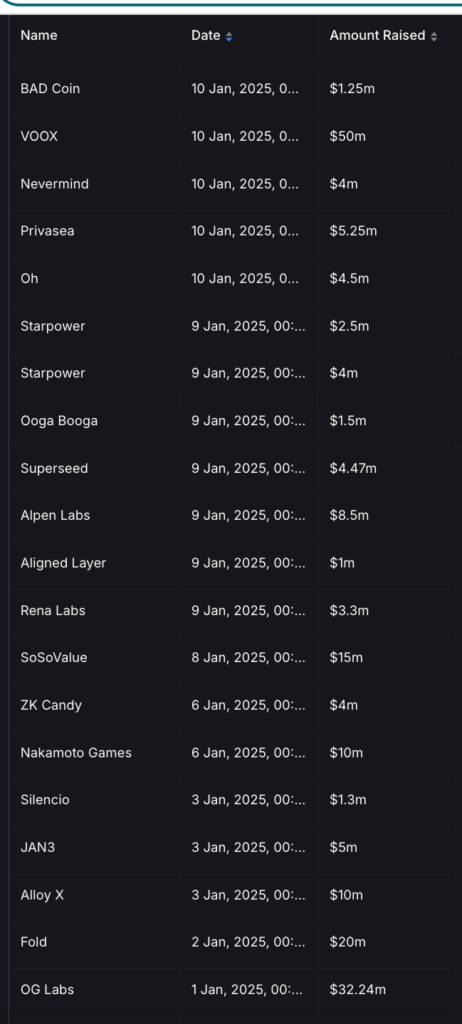 When I began writing this article, data from DeFi Llama had only logged the first 10 days of the New Year (2025), but even though it was a small dataset, it contained some interesting insights. Within that short period, 20 deals had been completed, raising a cumulative $187.76 million. Of those 20 deals, eight fundraising rounds were for amounts exceeding $5 million.